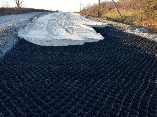 Підрядник Агентства два шари синтетичних полімерних матеріалів. Решітку із сотами наповнили піском, а георешітку засипали шаром щебеню і гранвідсіву. Такі проектні рішення мають втримати і стабілізувати шари основи.