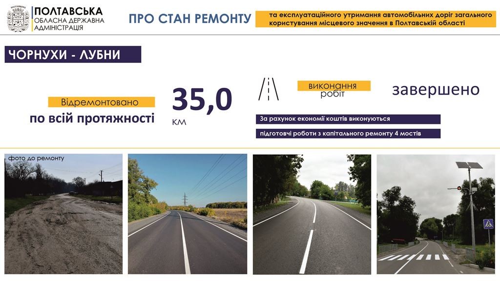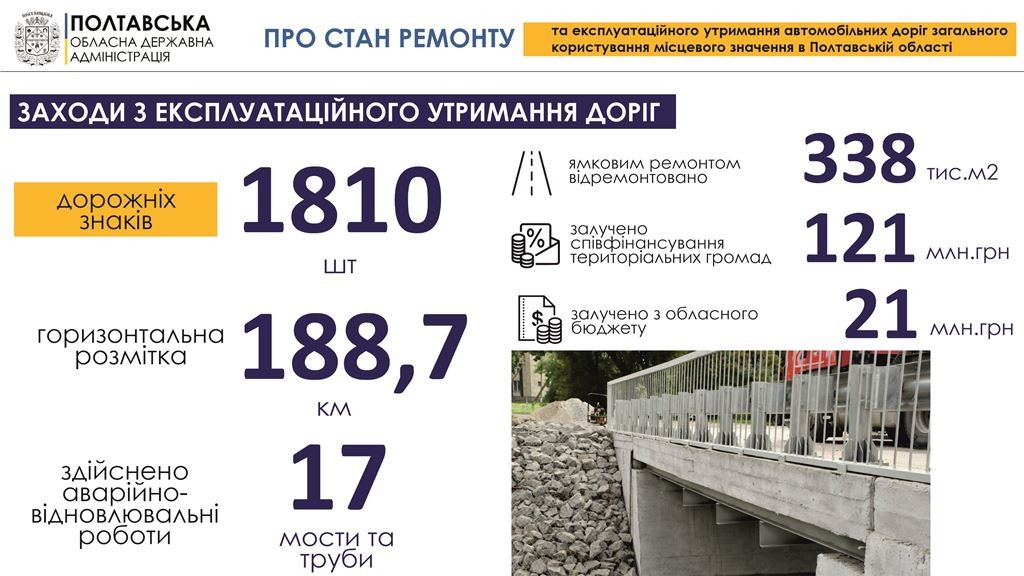 ‒ ямковим ремонтом відремонтовано 321 тис. м2 (75% від запланованого) дорожнього покриття та залучено 121 млн. грн. співфінансування територіальних громад.
