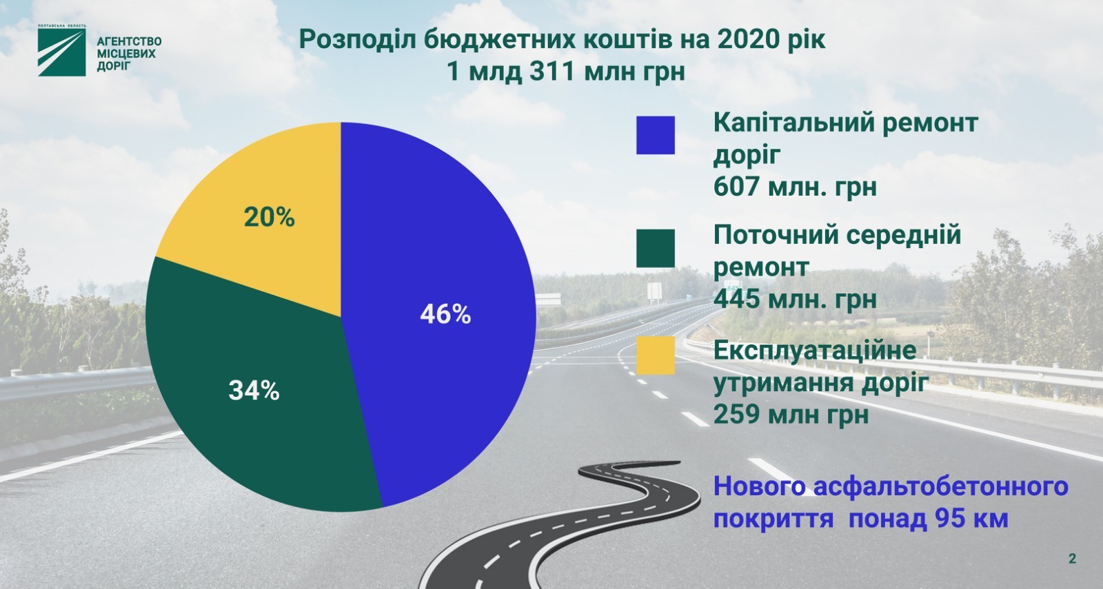Розподіл бюджетних коштів в сумі 1 млрд 311 млн грн з Державного дорожнього фонду на 2020 рік здійснюється наступним чином: 607 млн грн – капітальний ремонт, 445 млн грн – поточний середній ремонт та 259 млн грн – експлуатаційне утримання доріг.